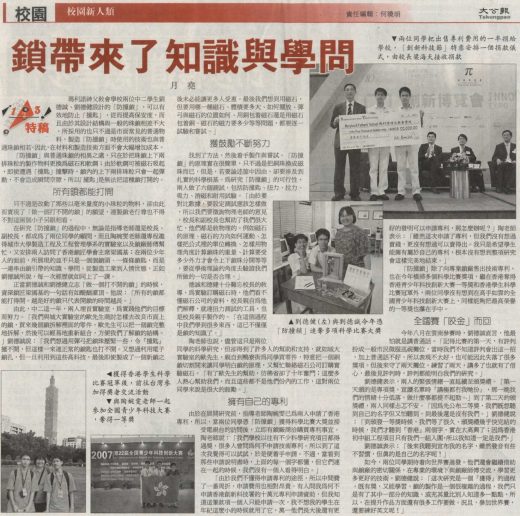 *** 這篇專題文章原於二零零八年二月十二日在《馬局長網誌@數碼21資訊科技策略》上發表。 *** 隨馬局長離任, 文章也移去了… … 新聞稿及演辭 > 演辭及專題文章 最近我與創新科技署的同事談到推廣創新的工作時,他們都提起在瑪利諾神父教會學校任教的陶婉雯老師。 陶婉雯老師幾年來不斷鼓勵和陪同學生參加各項科技比賽,經歷了無數挫折,也贏過不少掌聲和榮譽,常為同事們所津津樂道。去年她的兩名學生利用磁石及軟鋼改良一般鎖的設計,發明了防撞鎖,取得2007年香港學生科學比賽發明品組別的冠軍,香港青少年科技創新大賽一等獎,以及「全國青少年科技創新大賽」一等獎,更將防撞鎖的香港專利權賣給一家企業。誰說香港沒有勇於創新的人才?